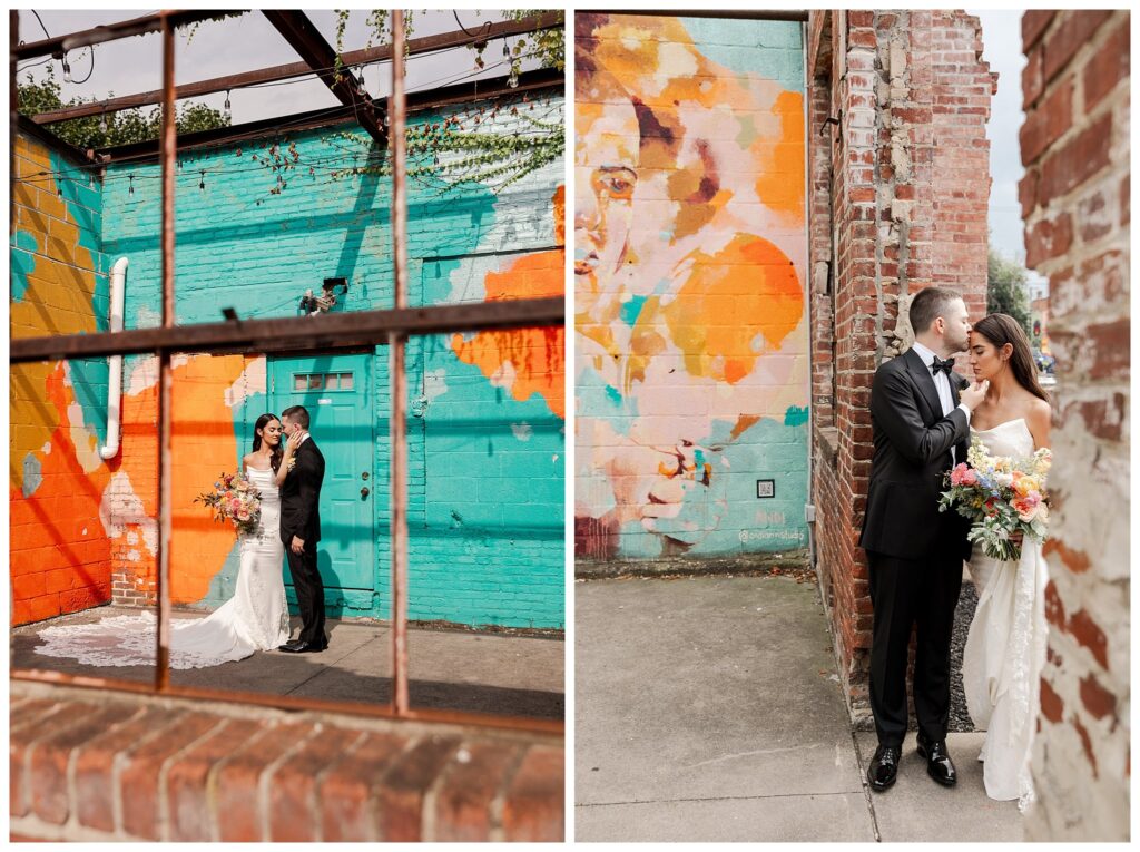 The Bond itself is an incredible venue. Its industrial aesthetic, complete with stunning murals, allowed us to take lots of creative, editorial-style photos. We captured Aleya and Adam in ways that reflected their personalities and love. Every corner of the space provided a unique backdrop, and experimenting with lighting, angles, and poses made the photos feel dynamic and one-of-a-kind.