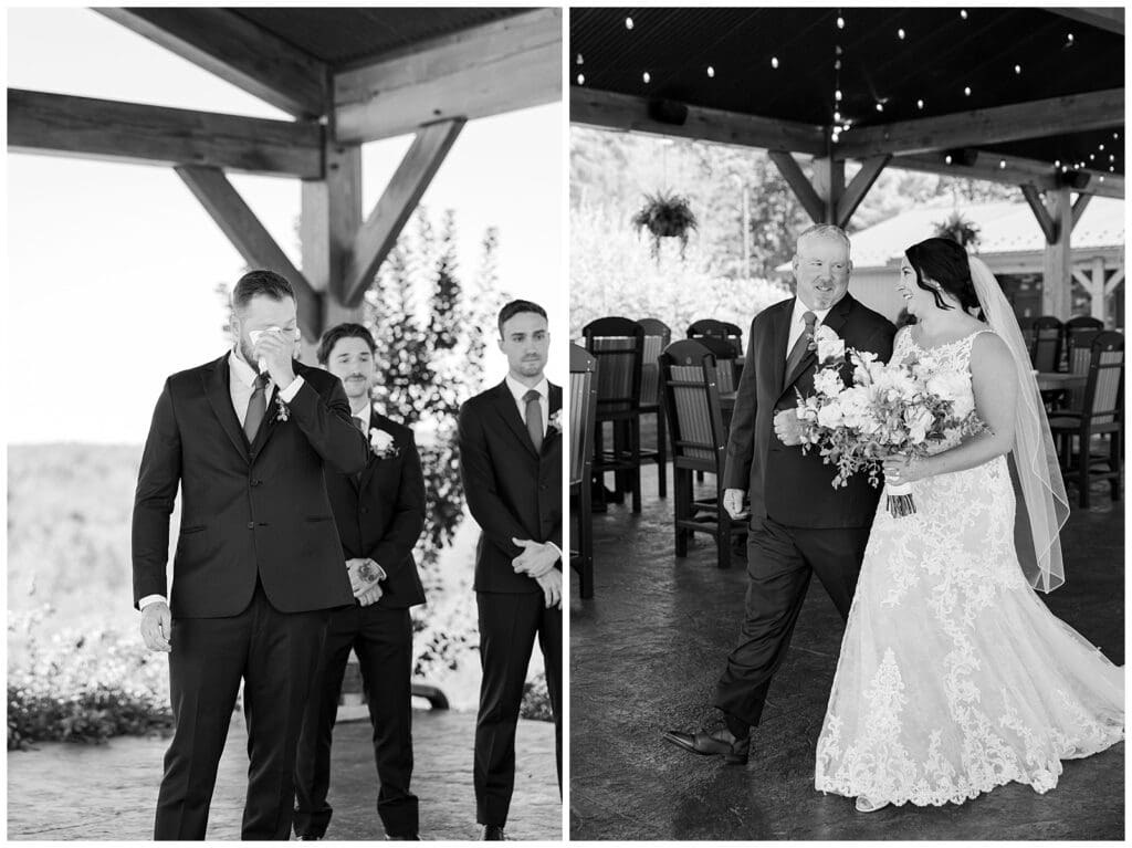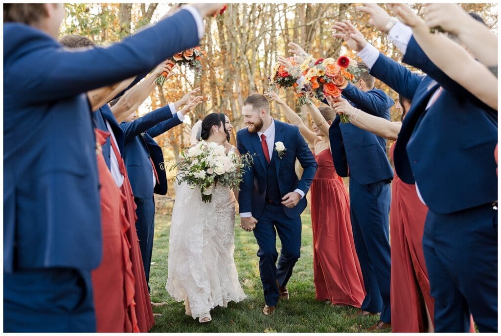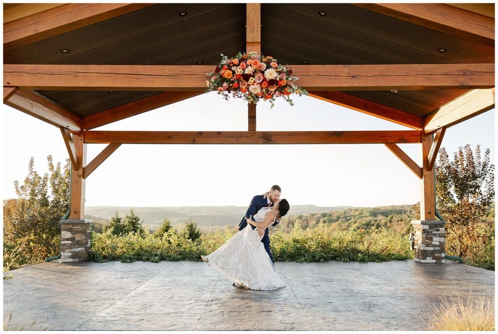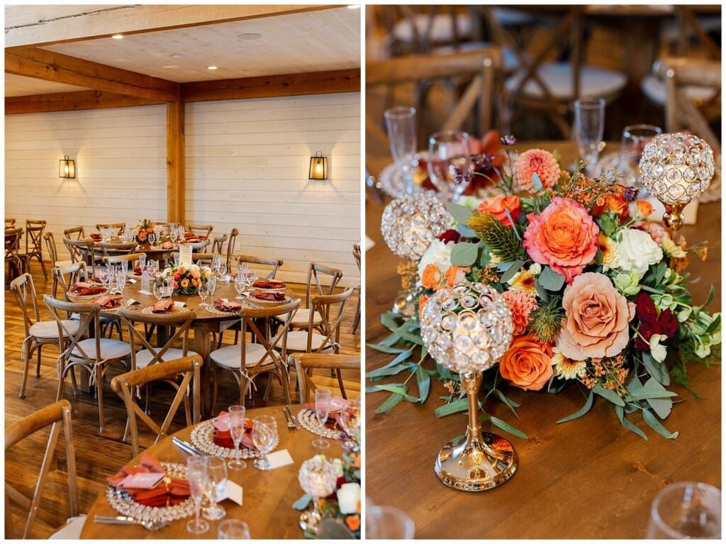 Then came the florals… absolutely breathtaking! Shades of burnt orange and soft yellow created a dreamy fall palette. The ceremony arch, centerpieces, and floral swags were some of the prettiest of the season. The florist truly transformed The Roost into a picture-perfect scene surrounded by Pennsylvania’s colorful mountains.