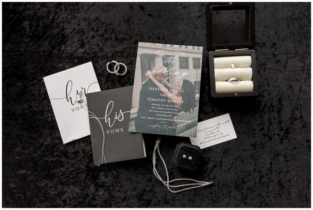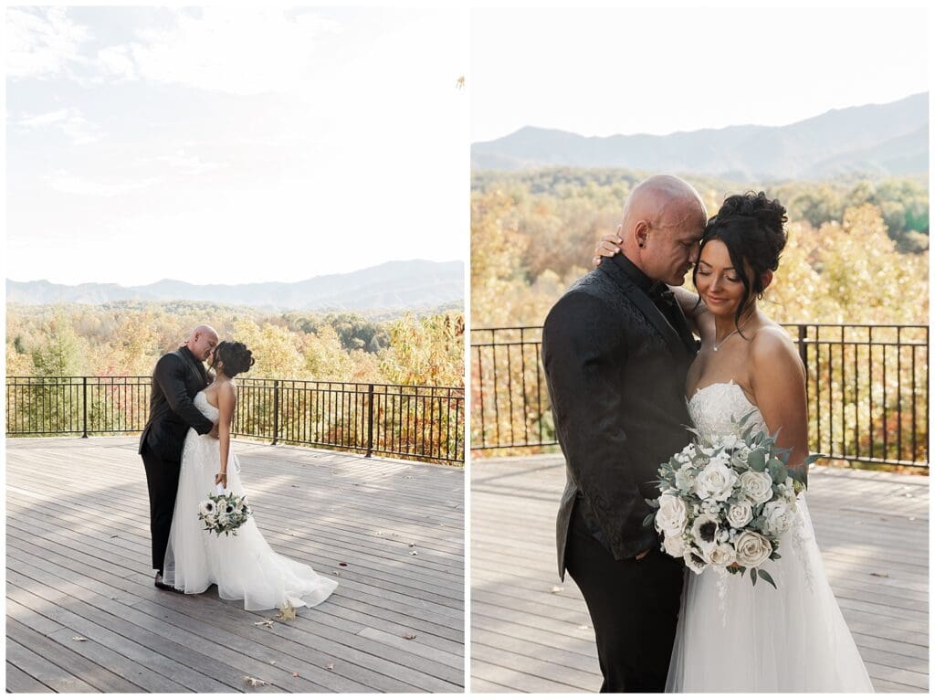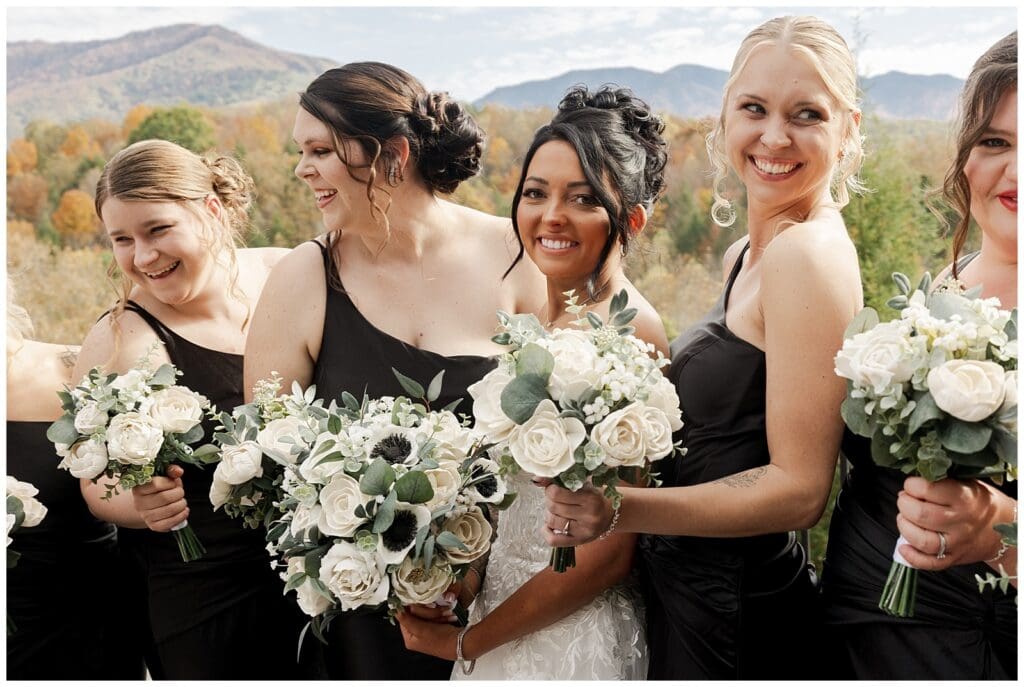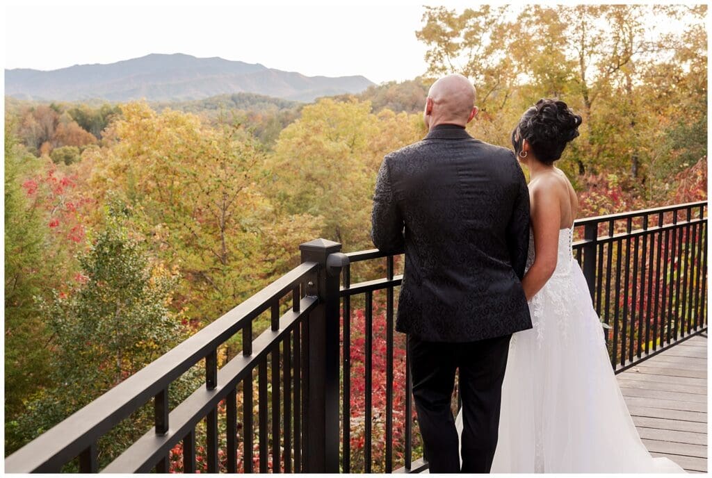Every detail of this Gatlinburg destination wedding was stunning. The venue featured rich wooden accents and massive glass windows that framed the Smoky Mountains perfectly. The couple chose a classic black dress code, and honestly, it was such a vibe. The contrast of black attire against the vibrant fall colors created an elegant, modern look that fit the mountain backdrop perfectly.