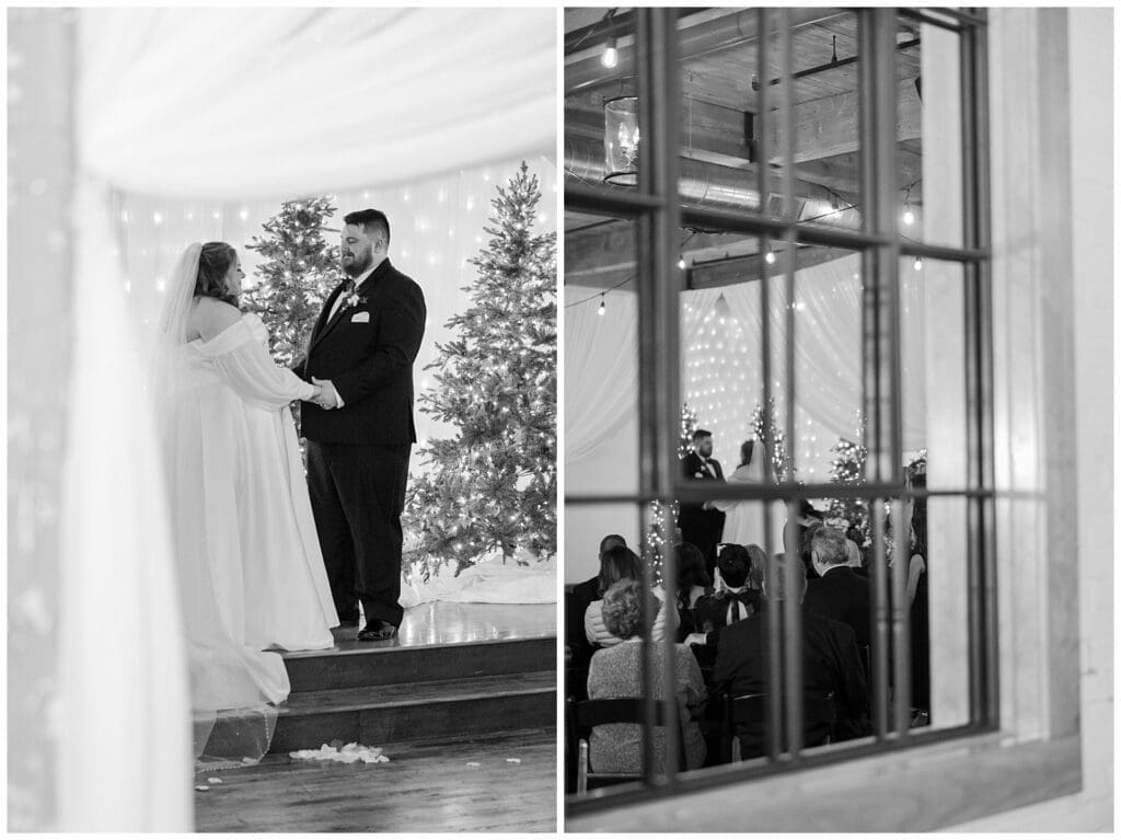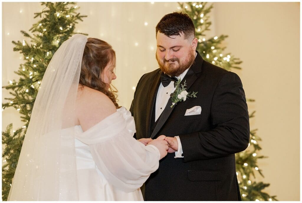 Inside, the ceremony space felt so magical and was filled with intentional details. Pre-lit Christmas trees lined the backdrop and candles glowed along the aisles. The pastor stood in the aisle, facing Sabrina and Kyle, allowing them to look out at their guests and take everything in. Parents also came forward to bless the rings.