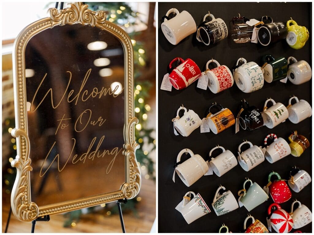 The reception continued the cozy vibe. A hot chocolate bar welcomed guests and a wall of mugs doubled as favors. Every detail felt personal, even drink tags were customized for guests!